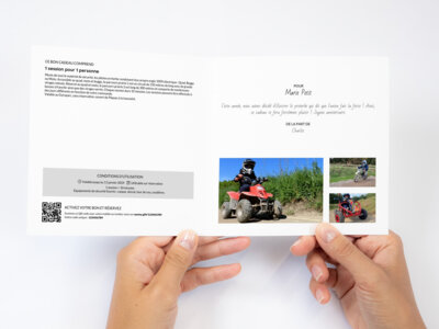 Munis de tout le matériel de sécurité, les pilotes en herbe conduisent leur propre engin 100% électrique : Quad, Buggy ou Moto. Accessible au quad, moto et buggy, le parcours prairie 1 est un circuit de 150 mètres de long avec de grands virages relevés. Réservé au quad et moto, le parcours prairie 2 est long de 300 mètres et comporte de nombreuses bosses à franchir ainsi que des virages serrés. Chaque session dure 10 minutes. Les sessions peuvent être effectués à des jours différents en fonction de votre commande.